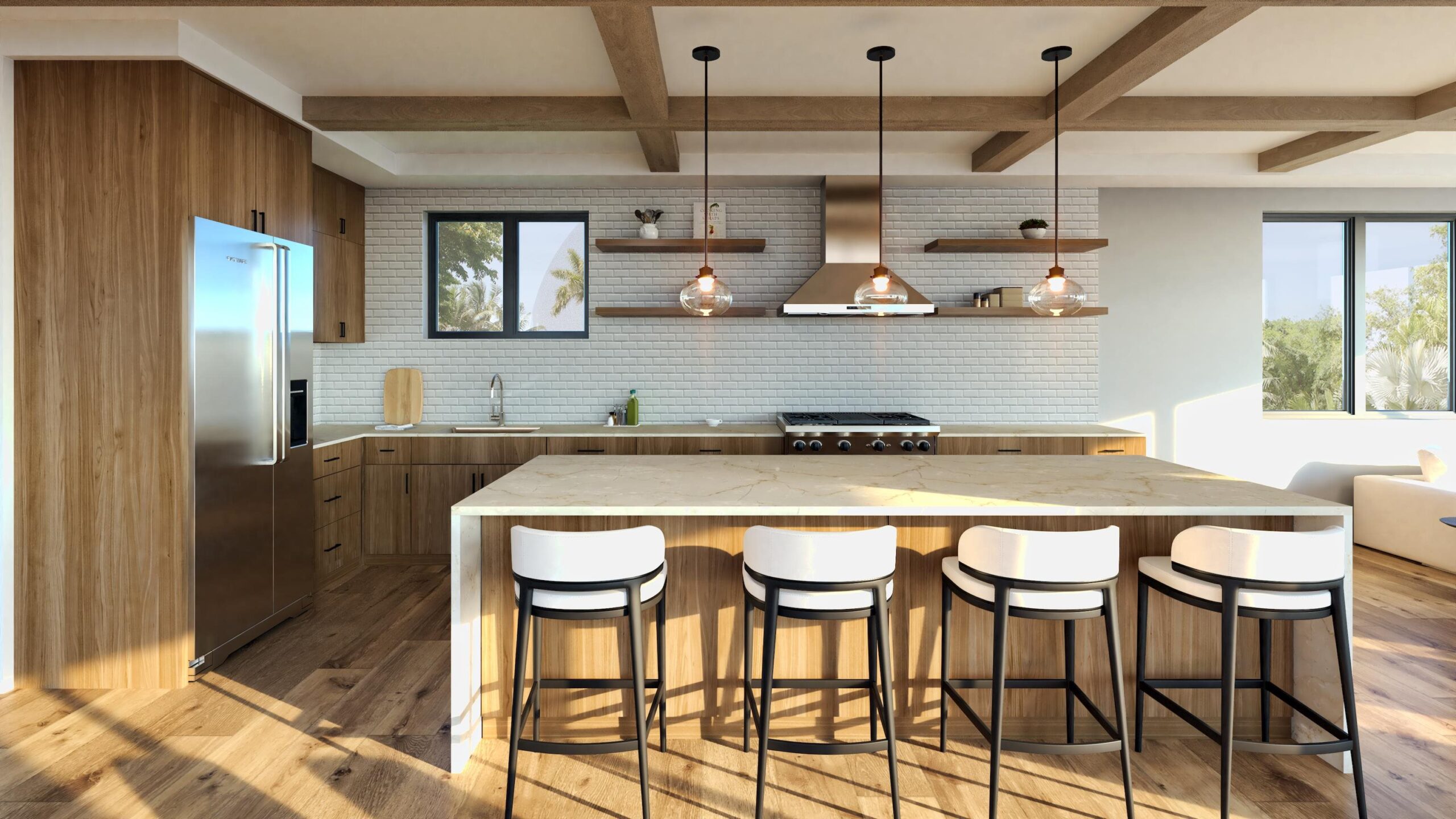 Clean architectural lines, expansive glass, and carefully selected finishes define the home’s modern island aesthetic. Natural light fills the interiors, highlighting the open-concept design and creating a seamless connection between indoor spaces and the surrounding tropical scenery.